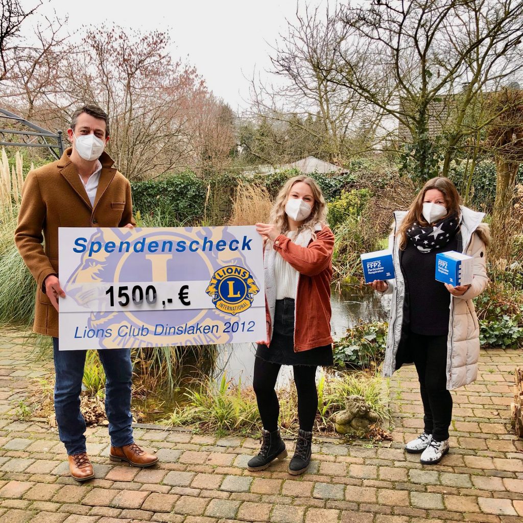 Die Dinslakener Tafel erhält ebenfalls 400 Masken der Spendenaktion „2.000 Masken“ des LC Dinslaken 2012. Unser Clubpräsident Jörg Spelleken überreicht die Masken an die erste Vorsitzende der Dinslakener Tafel Marion Muhic.